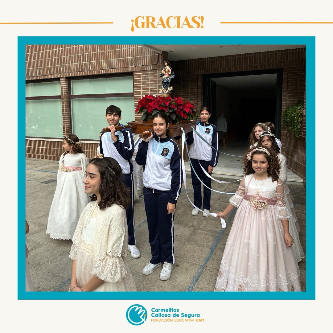 Ya llegan las banderas… nuestros alumnos de 4º de la ESO abren la procesión. Nuestra madre portada a hombros por los alumnos de 2º ESO procesionaria. Nuestros familiares vienen a verte, a pedirte por sus necesidades y a dar gracias.