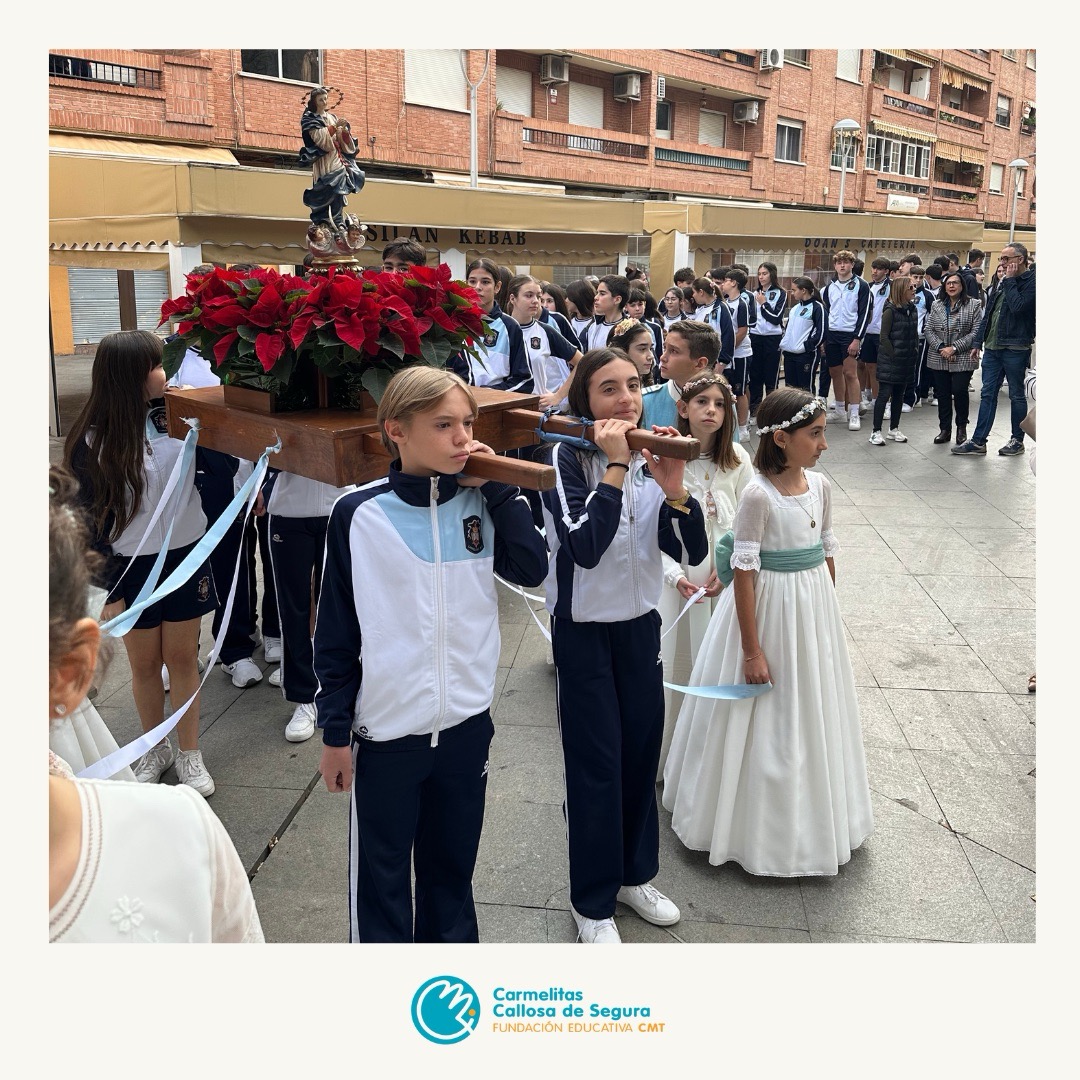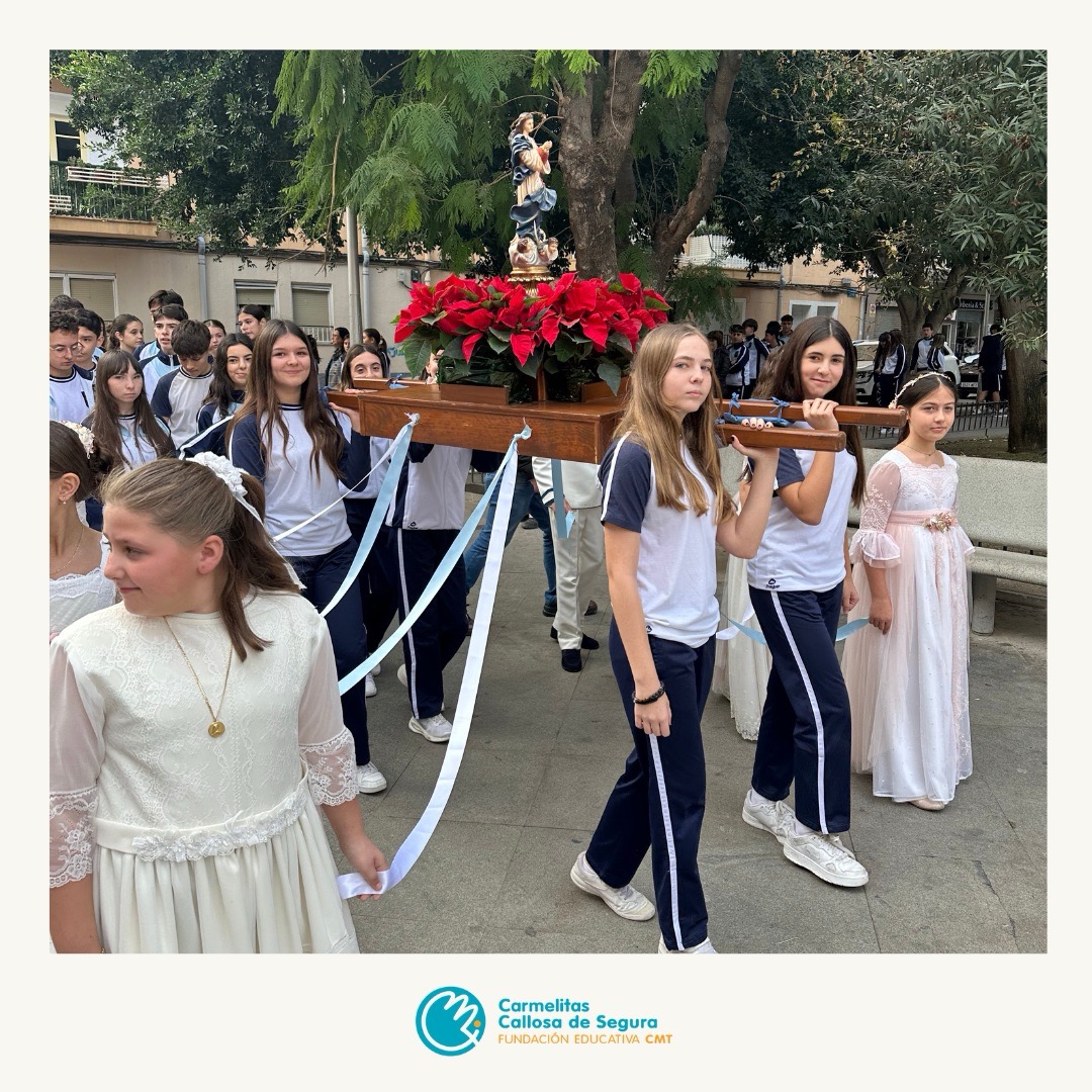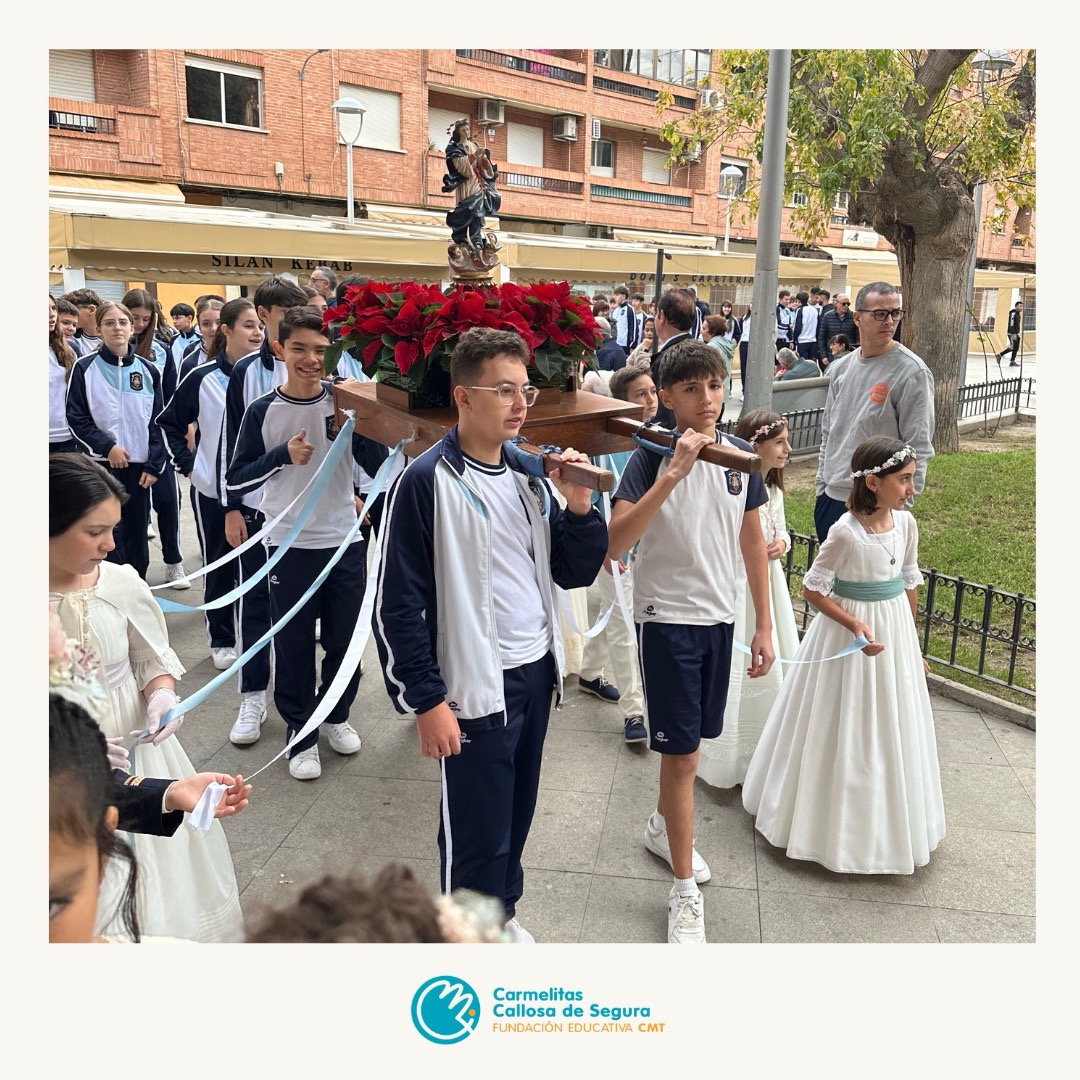 Ya llegan las banderas… nuestros alumnos de 4º de la ESO abren la procesión. Nuestra madre portada a hombros por los alumnos de 2º ESO procesionaria. Nuestros familiares vienen a verte, a pedirte por sus necesidades y a dar gracias.