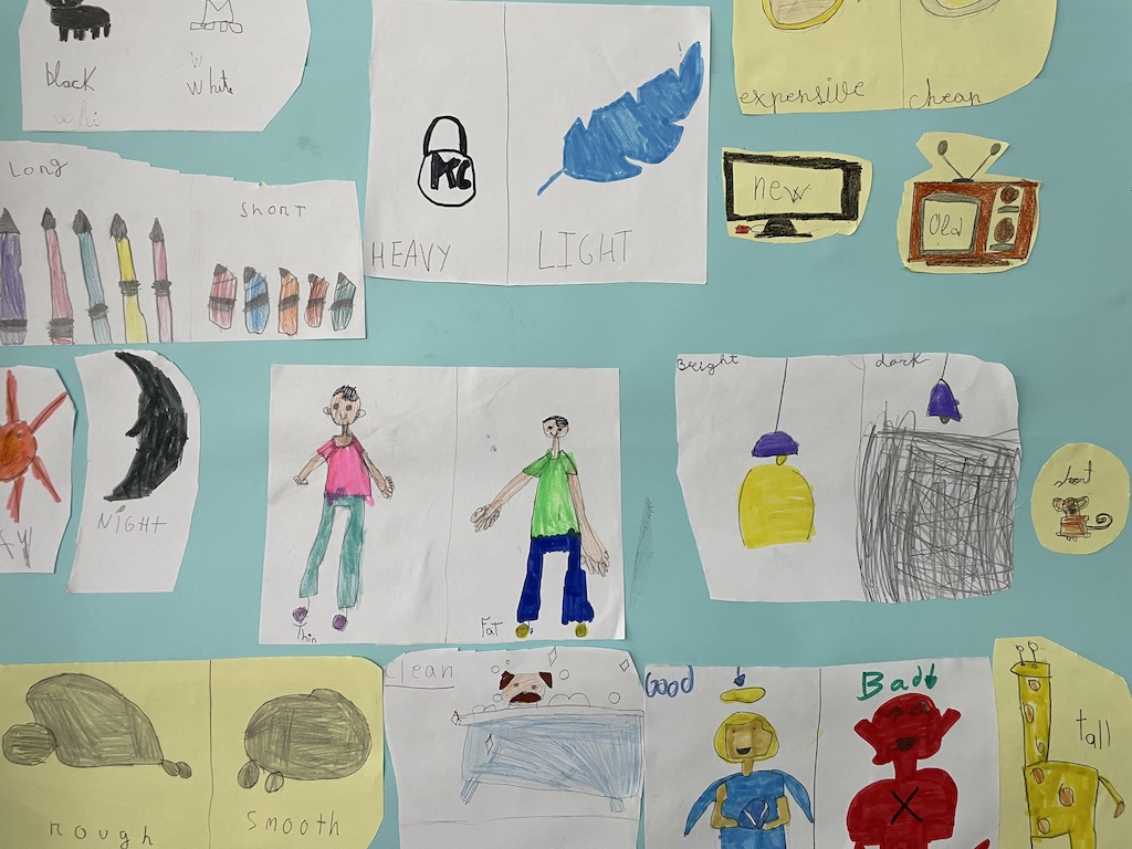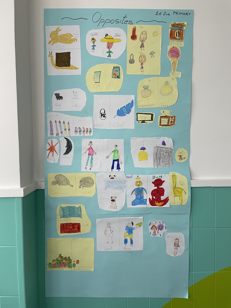 Los alumnos de 1º y 2º de primaria que asisten a las clases de inglés extraescolar aprenden el idioma a través de dinámicas y actividades lúdicas. En este caso trabajamos los opuestos (opposites) a través de la creación grupal de este genial panel de trabajo en el que los alumnos se han implicado mucho. GREAT JOB!