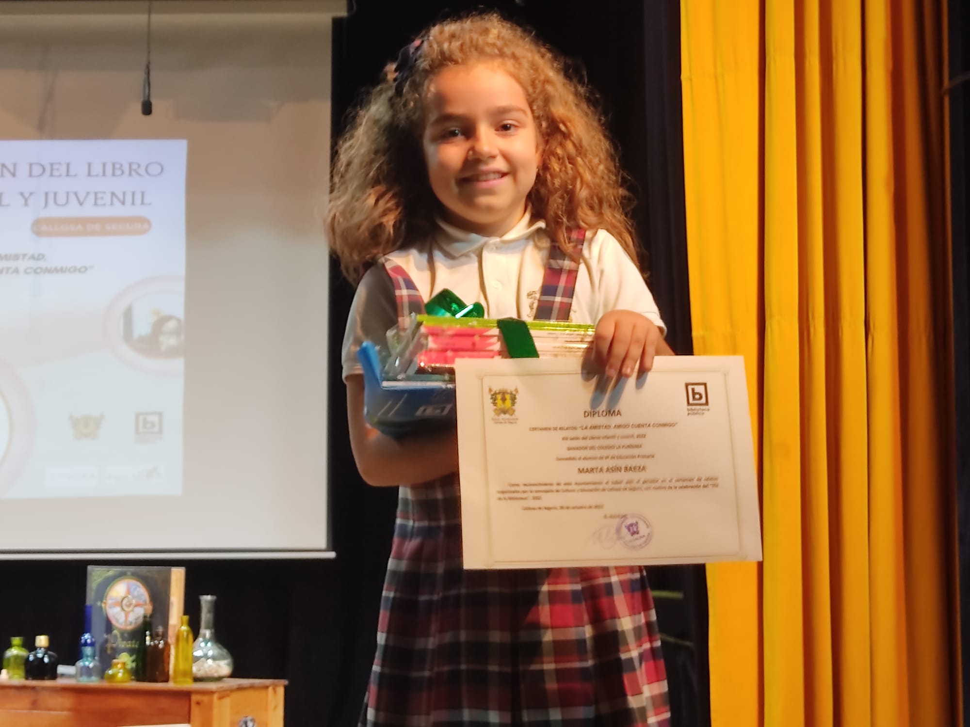 Este concurso se convoca para los alumnos de 3º de Primaria como una de las actividades del XIII Salón del libro infantil en nuestra ciudad. La alumna Marta Asín Baeza ha sido premiada por el precioso trabajo realizado titulado “Amistad hasta el fin”. El viernes pasado, 28 de octubre tuvo lugar la entrega de los premios en la Casa de Cultura.