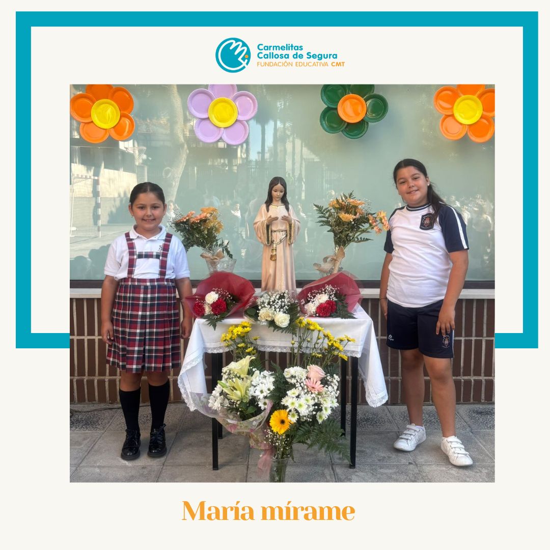 Al final, todos juntos ofrecimos nuestras flores a la Virgen, llenando el colegio de color, alegría y sentido.