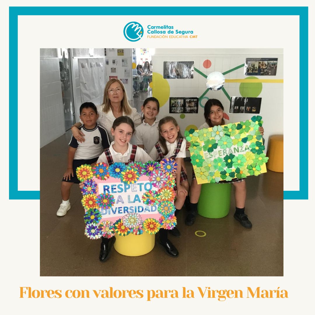 Todos los cursos han decorado diferentes flores, cada una representando valores que queremos vivir y ofrecer a la Virgen.