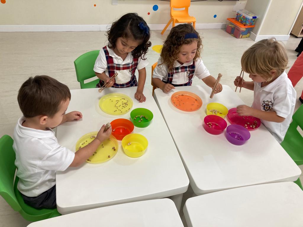 Los alumnos y alumnas de 3 años desarrollan la motricidad fina y al mismo tiempo trabajan la clasificación de objetos de manera lúdica.