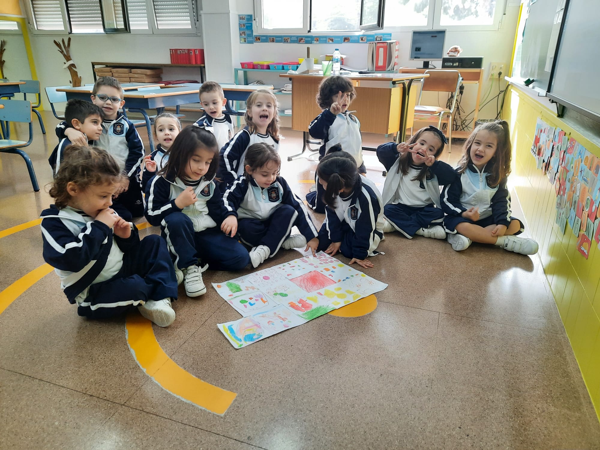 Los alumnos de Infantil de 4 años han expresado su propia identidad mediante la realización de una manta de patchwork en la que están visibles los colores y dibujos que representan a cada uno de los miembros del grupo.