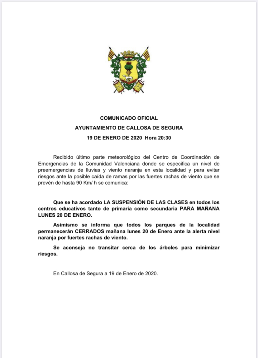 COMUNICADO OFICIAL DEL AYUNTAMIENTO DE CALLOSA DE SEGURA