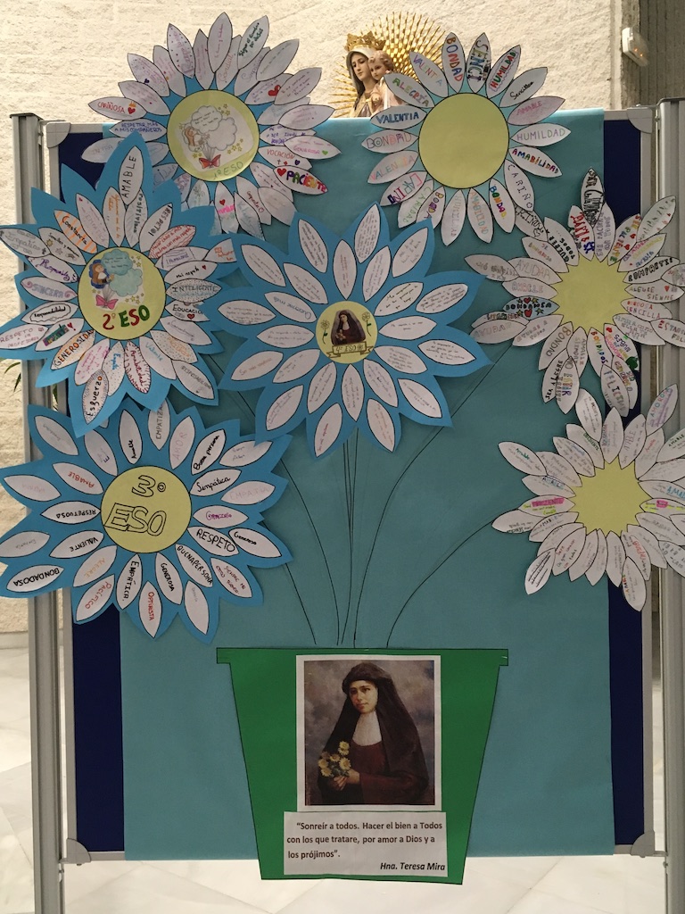 Hoy día 26 de febrero nos hemos reunido en la capilla del colegio para compartir y recordar a una humilde y buena persona, la Hermana Teresa Mira. Además, en el aula, el alumnado del colegio ha trabajado los valores y virtudes de la Hermana Teresa Mira, plasmándolos en pétalos, para luego formar entre toda la clase una margarita. Cada pétalo de la margarita simboliza un objetivo basado en valores para seguir e intentar crecer como personas día a día.