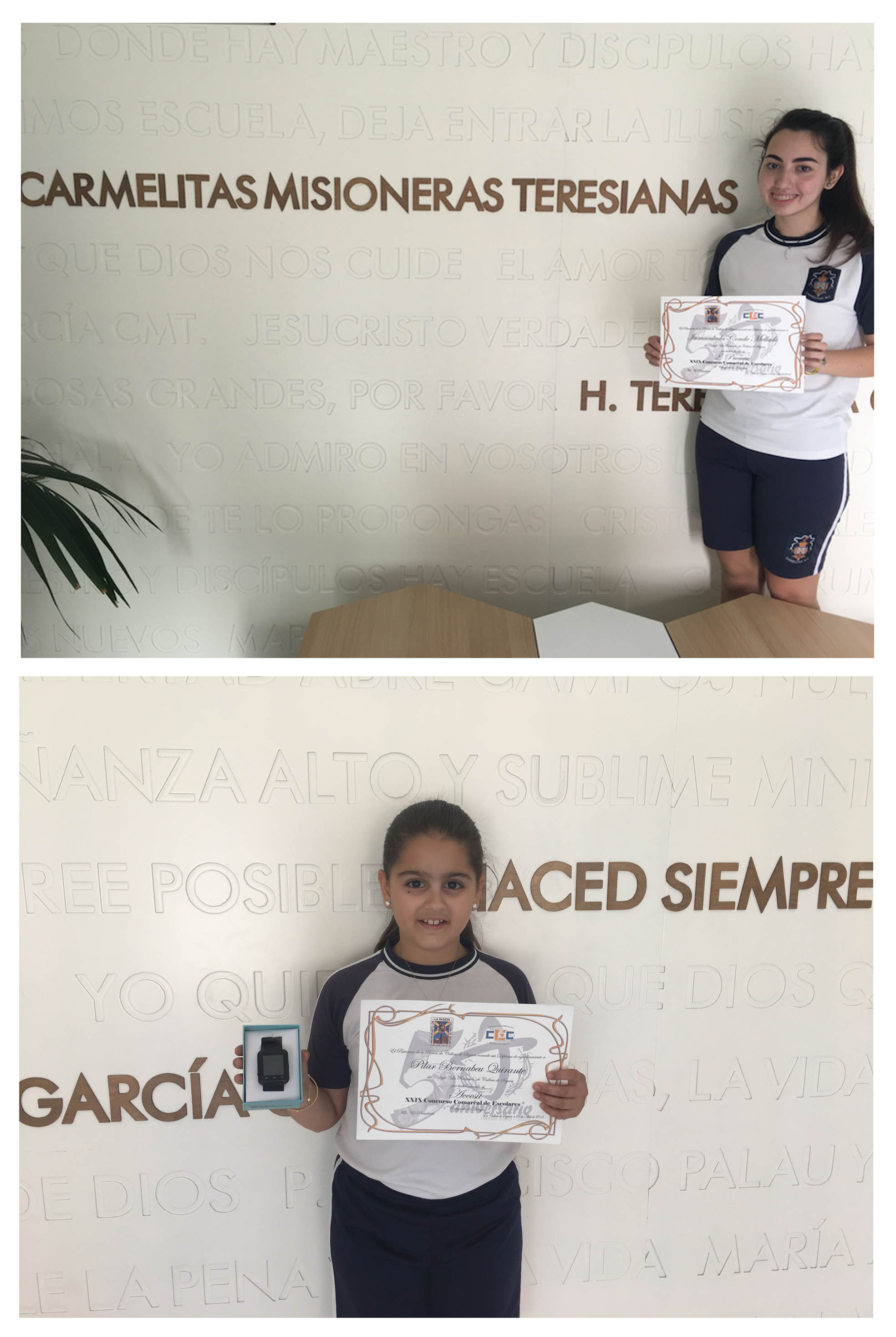 Inmaculada Conde Mellado, de tercero de ESO, y Pilar Bernabeu Quirante, alumna de cuarto de Primaria, han recibido el Premio Accesit de Dibujo 1ª categoría y el 2º Premio de Narrativa 2ª categoría respectivamente.