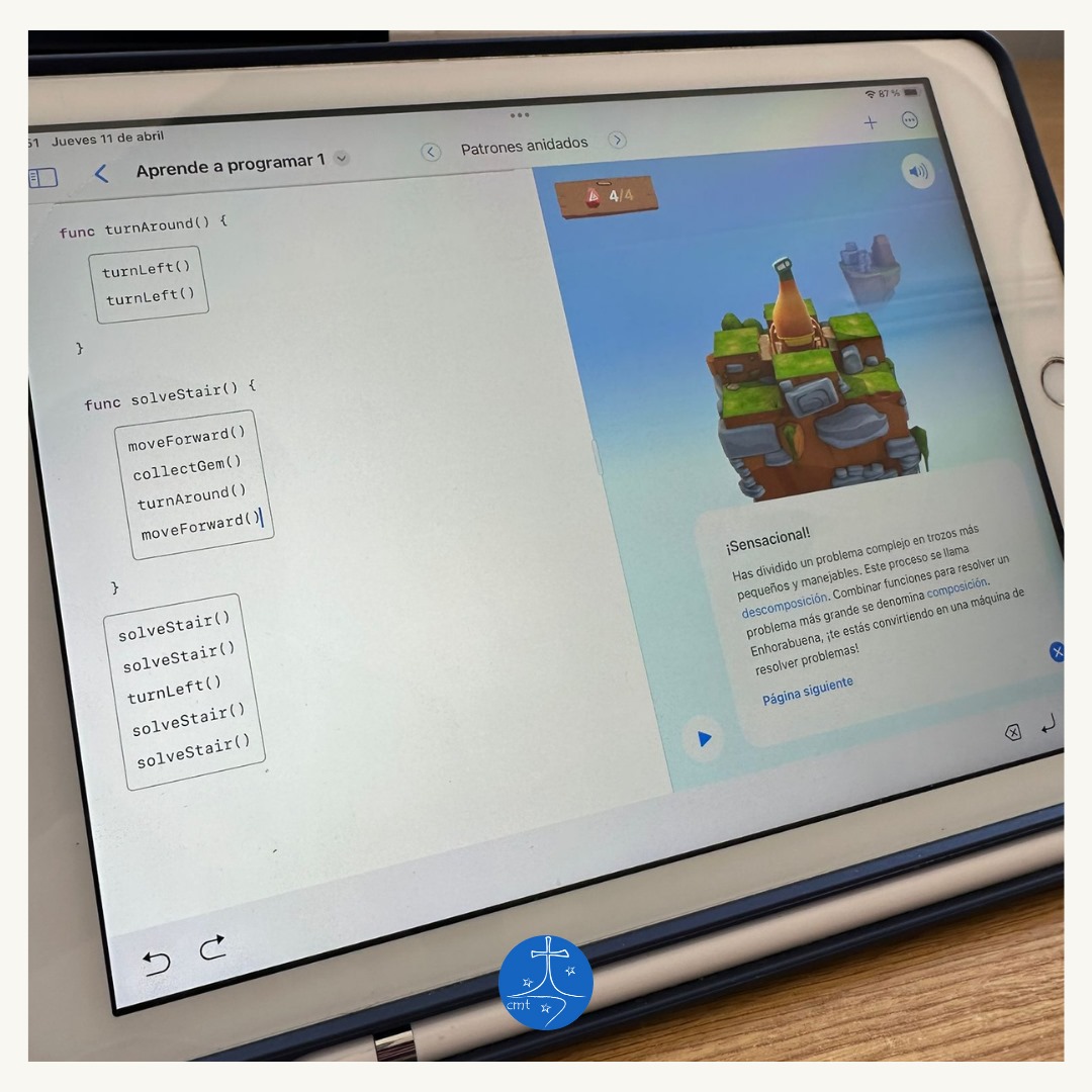 A través de la app Swift Playgrounds de Apple, nuestros alumnos ejecutan comandos, crean variables, funciones y algoritmos para ayudar al personaje a superar los diferentes retos que se les van presentando.