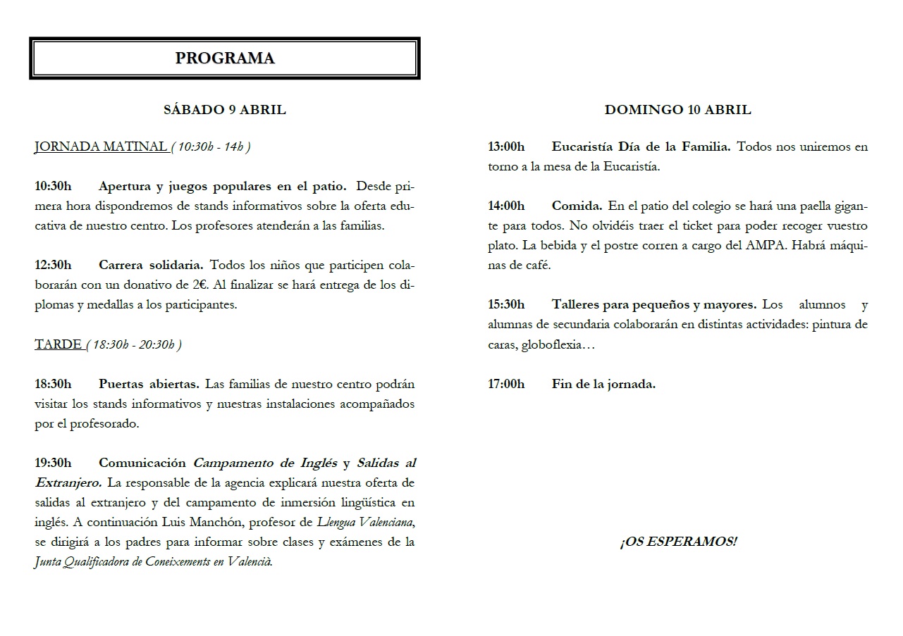 Durante los días 9 y 10 de abril celebraremos en nuestro colegio la Semana de la Familia. Os esperamos.