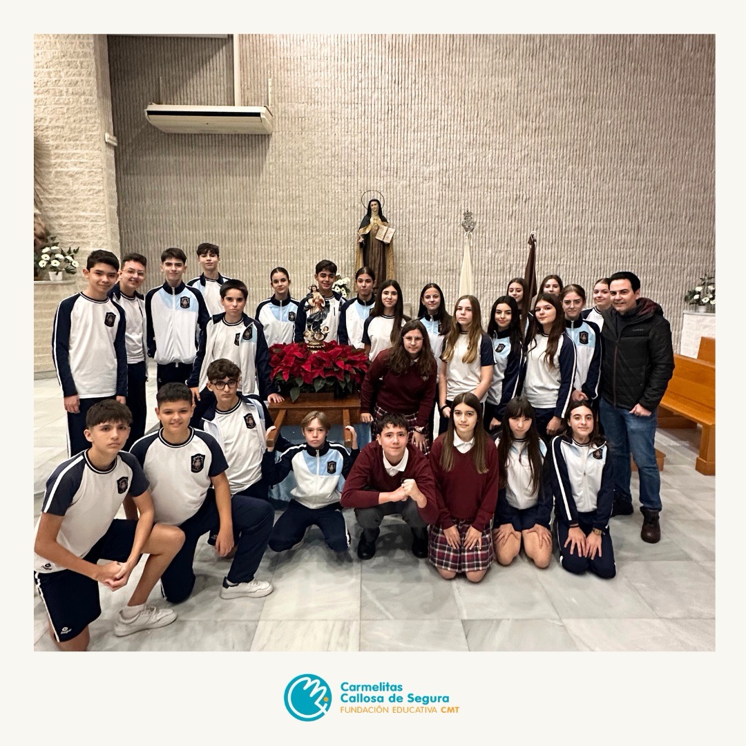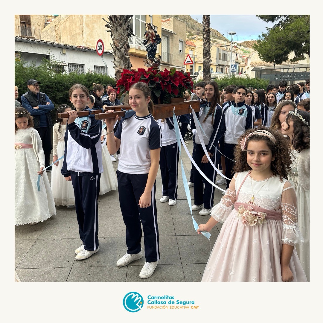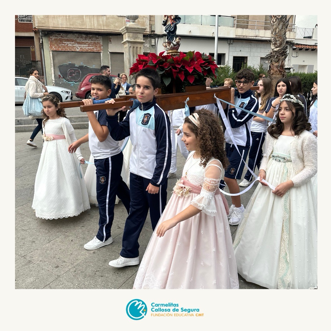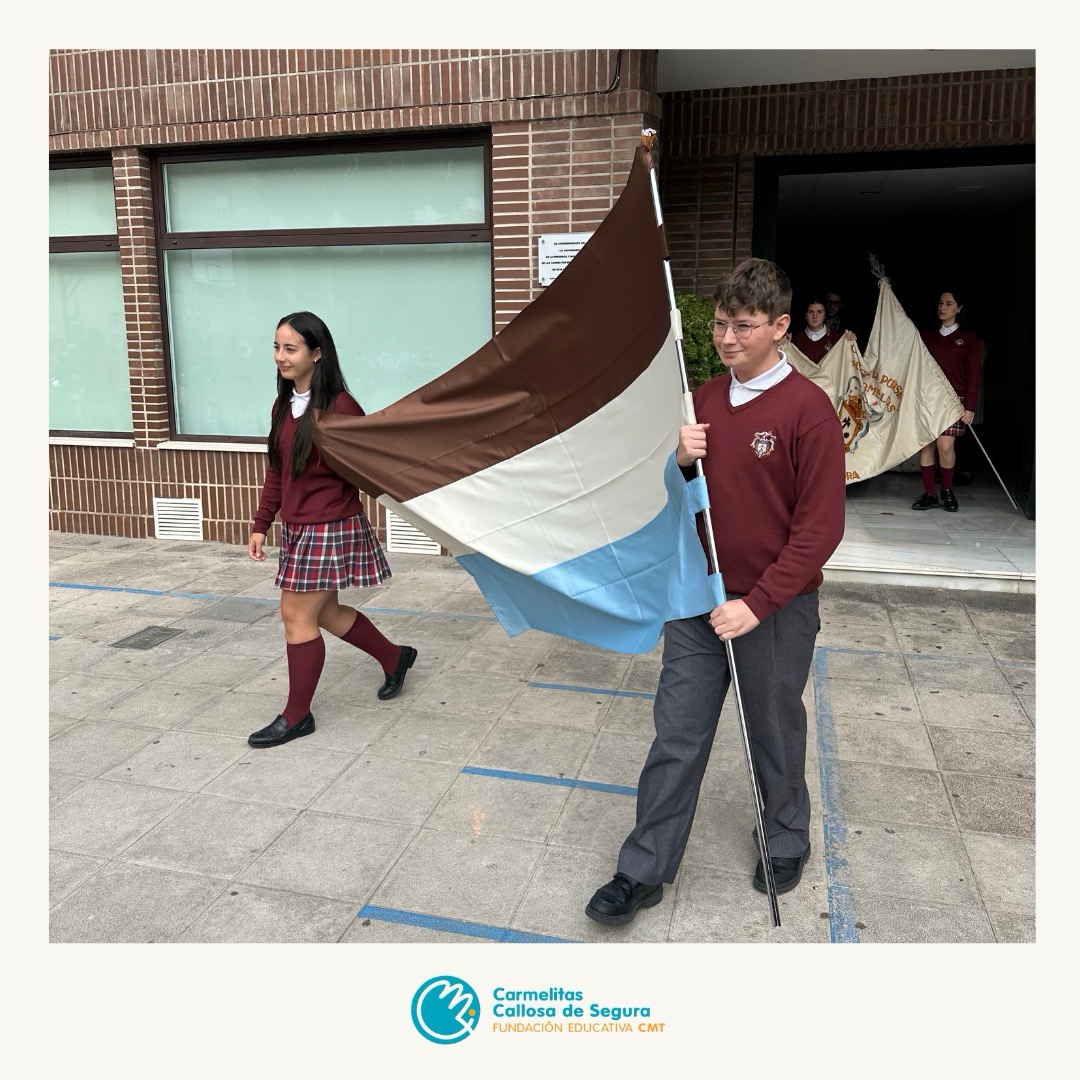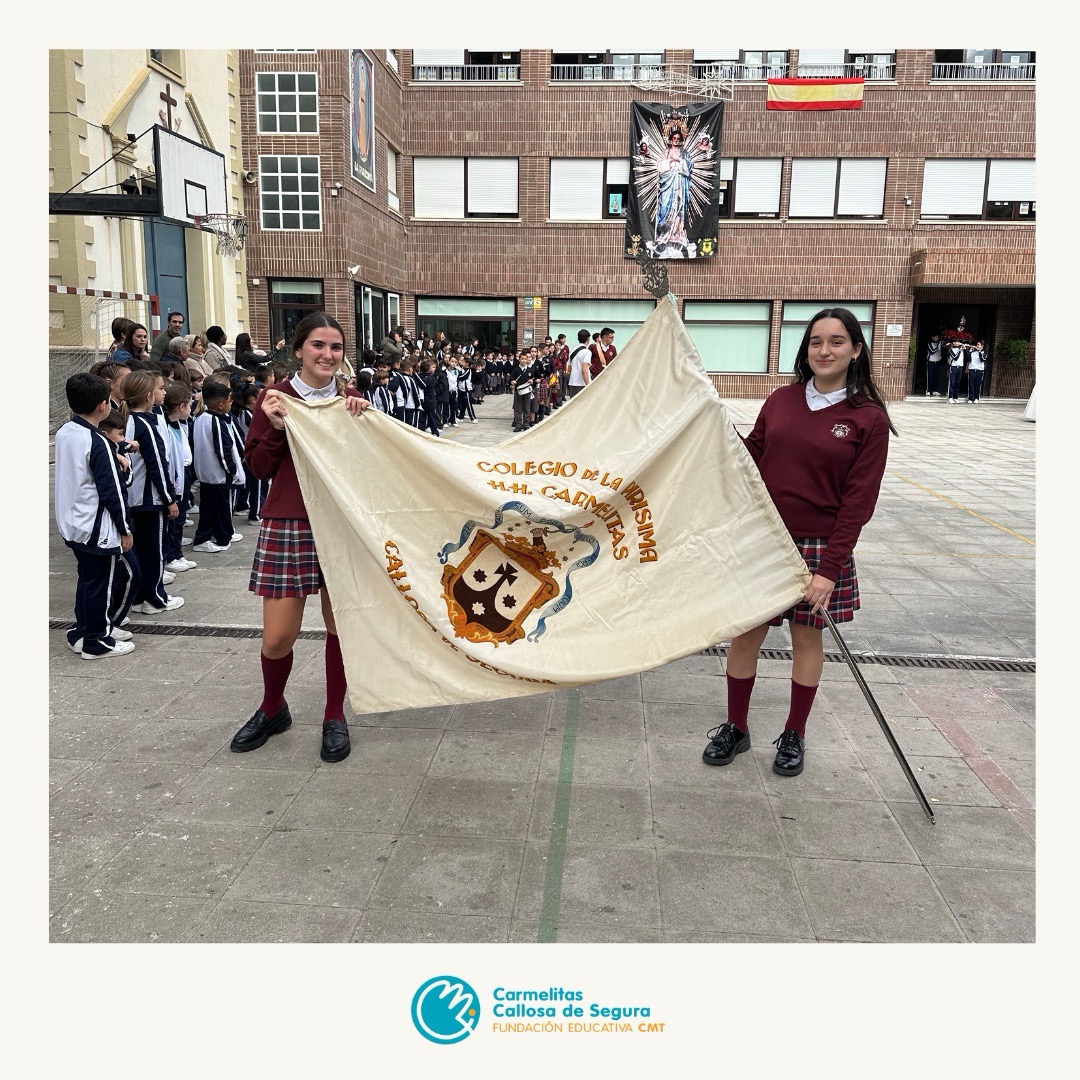 Ya llegan las banderas… nuestros alumnos de 4º de la ESO abren la procesión. Nuestra madre portada a hombros por los alumnos de 2º ESO procesionaria. Nuestros familiares vienen a verte, a pedirte por sus necesidades y a dar gracias.