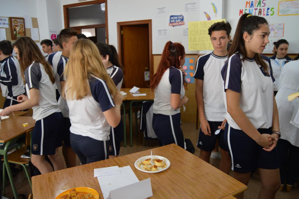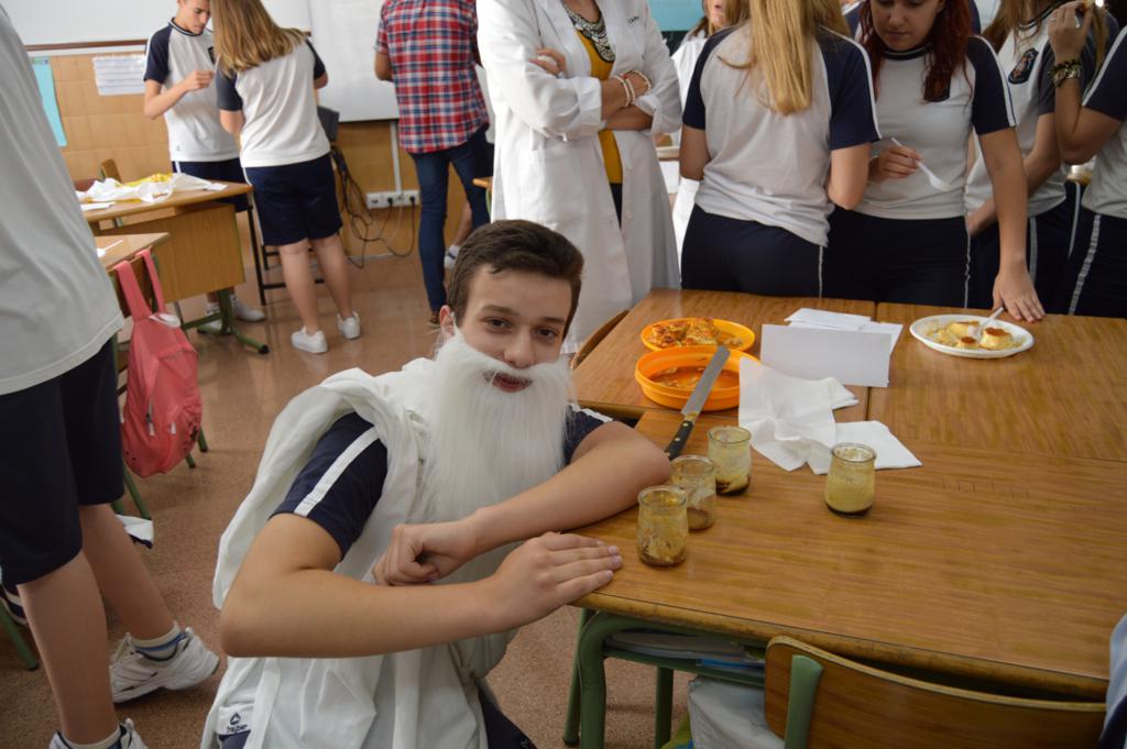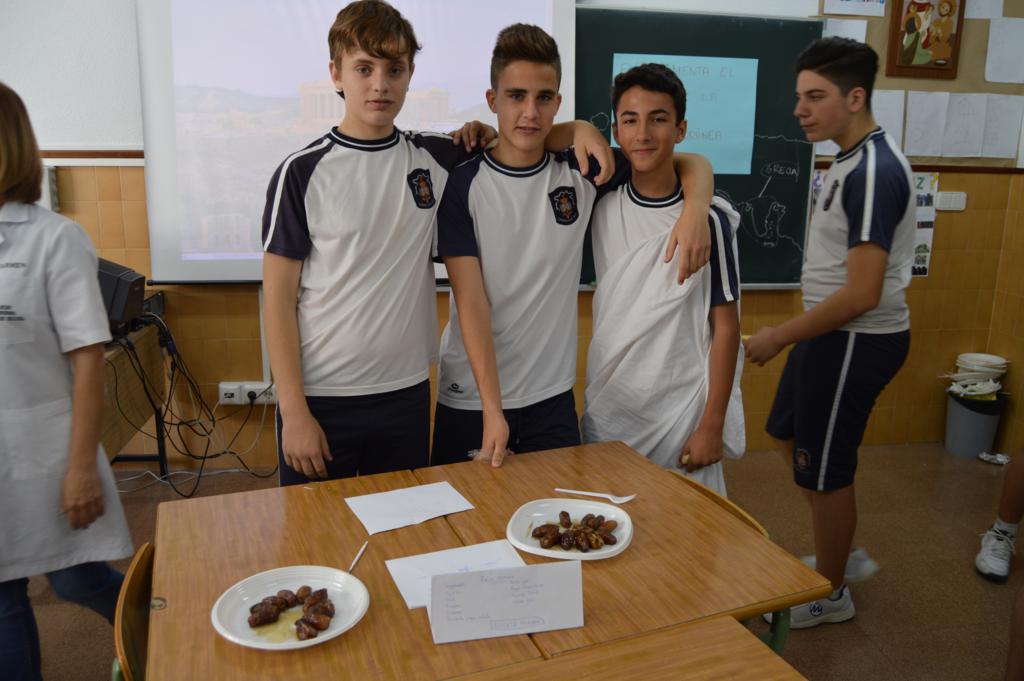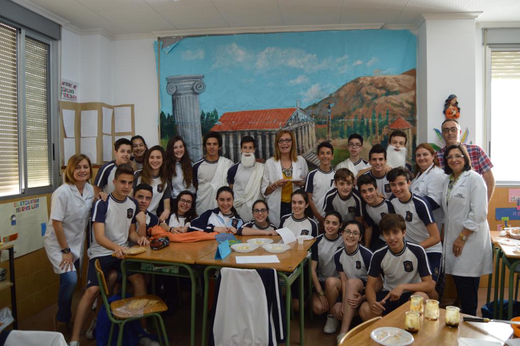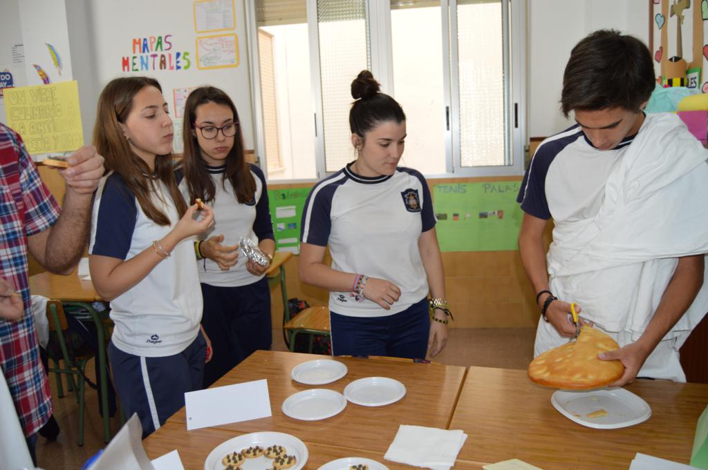La actividad ha sido organizada por el grupo-departamento de la vida cotidiana que esta evaluación está realizando proyectos sobre la gastronomía, el papel de la mujer y la infancia en la Grecia helenística y la Roma imperial. En esta parte del proyecto se han repartido antiguas recetas de aperitivos y postres de aquellas épocas que cimentaron la dieta mediterránea. Cada grupo o departamento las ha elaborado de la forma más fiel posible, aportando el nombre y los ingredientes y las han dado a probar al resto de los compañeros, a 4º de la ESO y al profesorado.