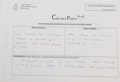 Esta tarde ha tenido lugar el primer encuentro de Café para Padres, en el que el colegio ha dispuesto de la oportunidad de presentar a los padres las iniciativas de innovación metodológica que se están llevando a cabo en las clases. Nuestros profesores Jordi Rodríguez y Mª Carmen Mas acercaron a los asistentes las dinámicas que se desarrollan diariamente en nuestro centro y expusieron nuestra importante apuesta por el cambio en las aulas.