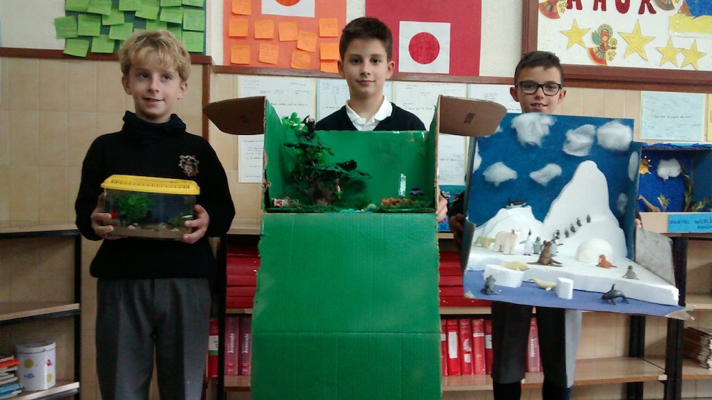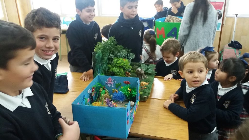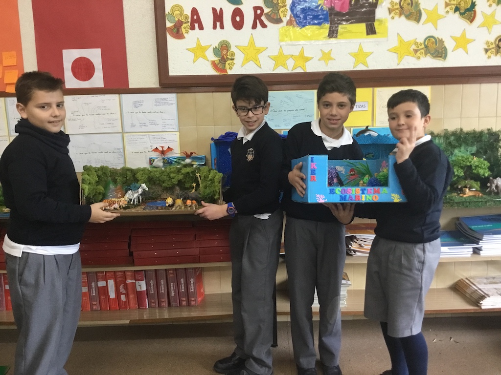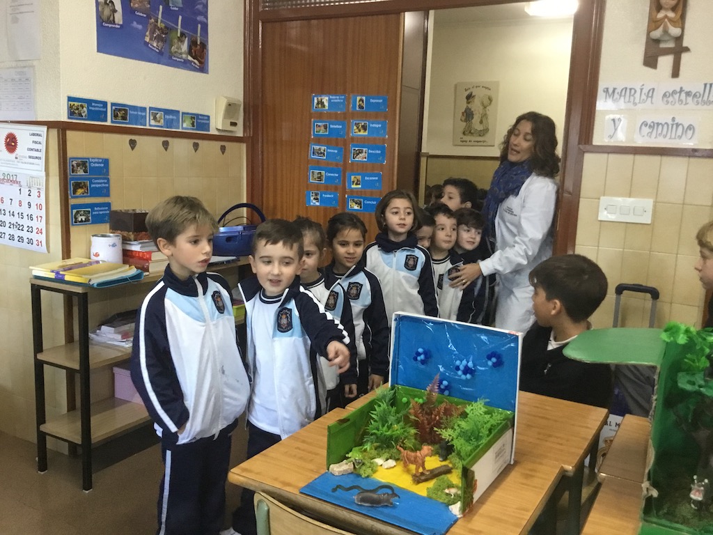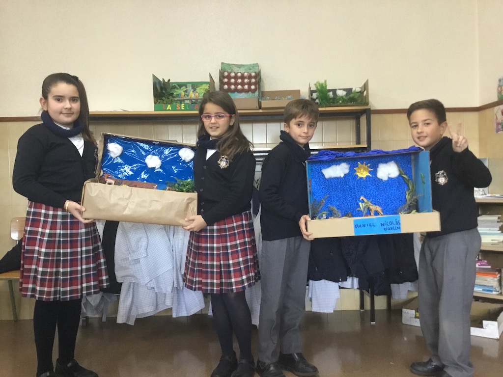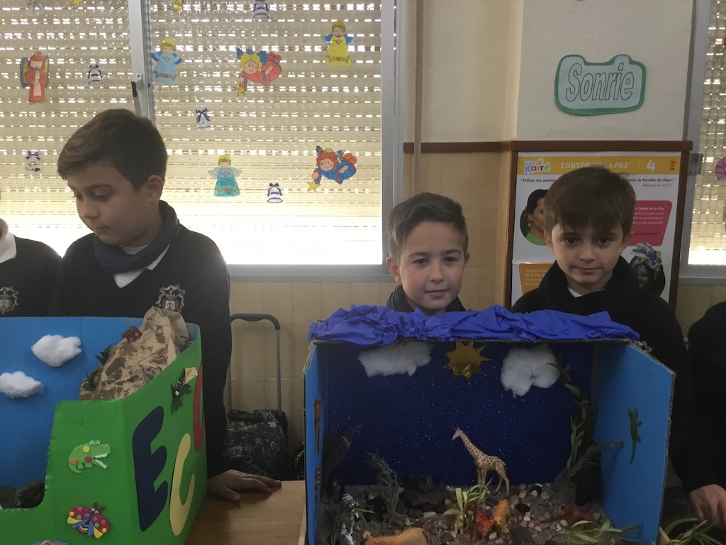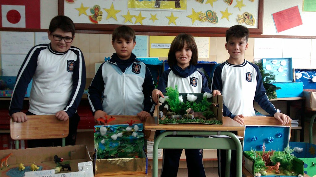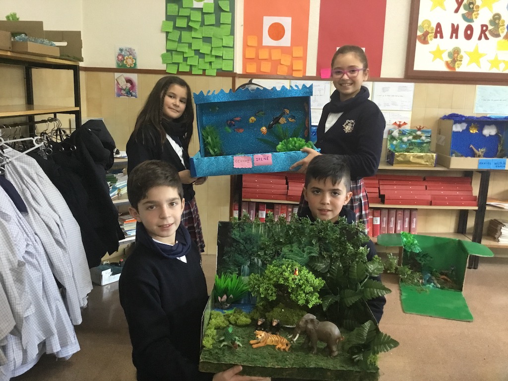 Los alumnos de 4º de Primaria han trabajado los elementos que forman un ecosistema, creando con sus propias manos ecosistemas terrestres y acuáticos, indagando y recogiendo información sobre los seres vivos que forman la comunidad del ecosistema elegido. Los alumnos han plasmado en sus trabajos ideas muy innovadoras, siendo creativos a la hora de realizar los diferentes ecosistemas. Posteriormente los cursos de Ed. Infantil y Primaria pasaron a verlos, dándoles la enhorabuena por lo bonitos y vistosos.