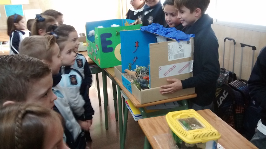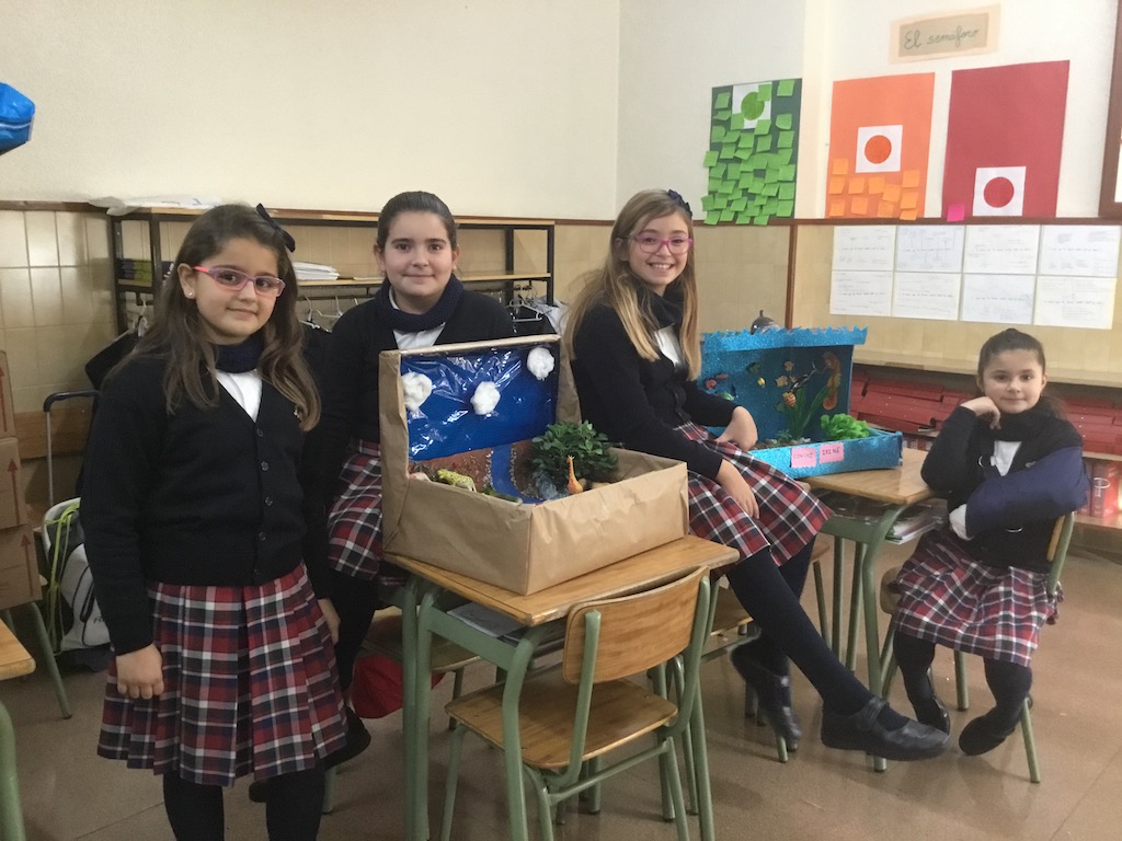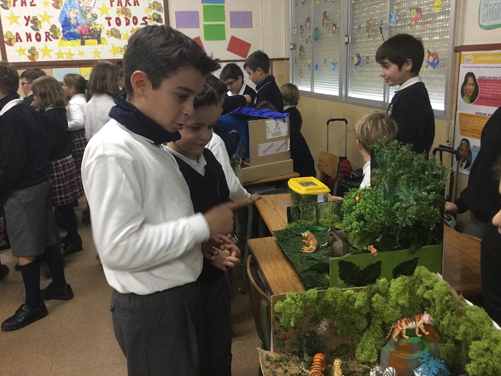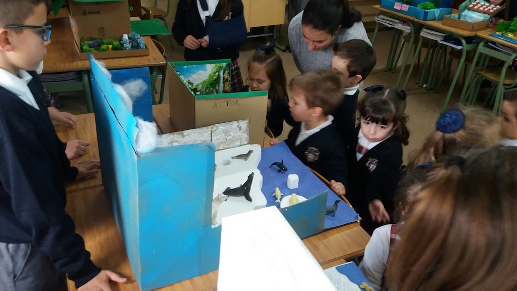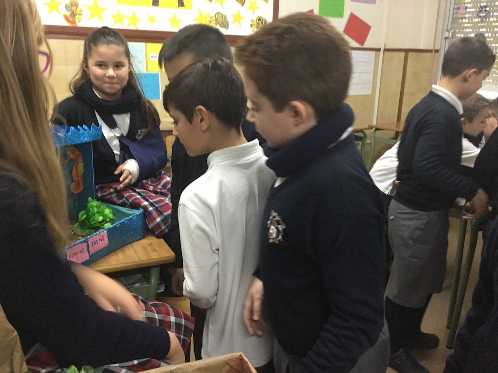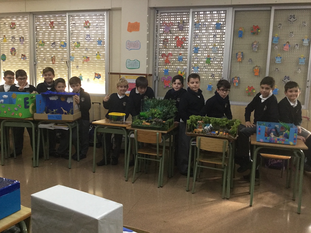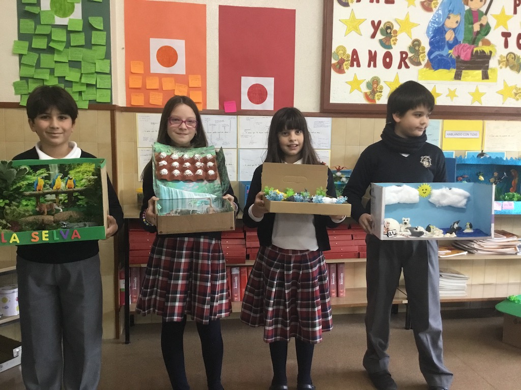 Los alumnos de 4º de Primaria han trabajado los elementos que forman un ecosistema, creando con sus propias manos ecosistemas terrestres y acuáticos, indagando y recogiendo información sobre los seres vivos que forman la comunidad del ecosistema elegido. Los alumnos han plasmado en sus trabajos ideas muy innovadoras, siendo creativos a la hora de realizar los diferentes ecosistemas. Posteriormente los cursos de Ed. Infantil y Primaria pasaron a verlos, dándoles la enhorabuena por lo bonitos y vistosos.