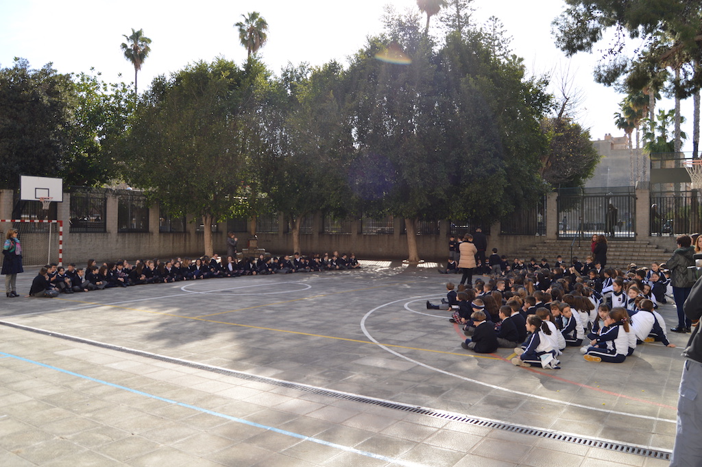 Todos los alumnos y profesores del Colegio “La Purísima”, se han dado cita hoy en el patio para celebrar el día de la Paz y la No violencia que será el próximo 30 de enero.