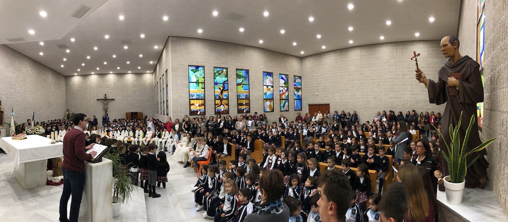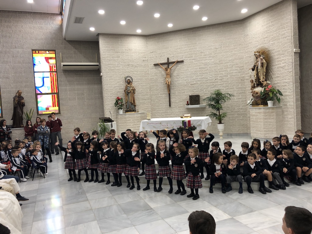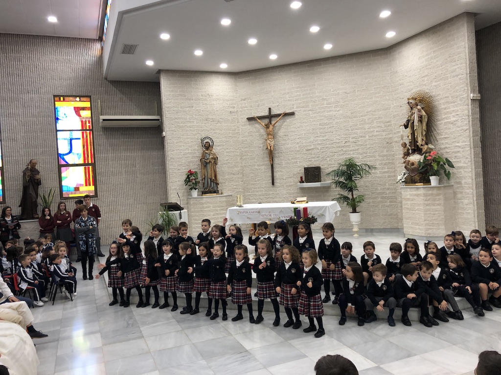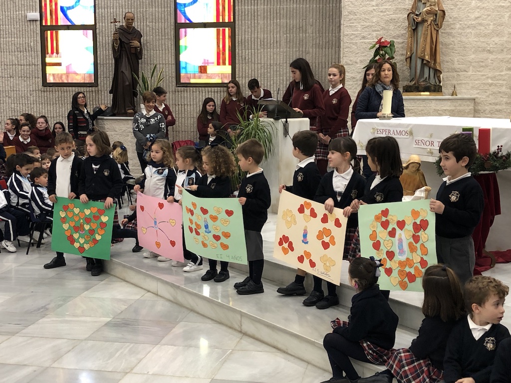 Los niños de cuatro años de Educación Infantil cantaron una bonita canción para dar comienzo a la celebración y seguidamente una representación de los niños de Educación Infantil y Educación Primaria ofrecieron un mapa en red con una imagen de La Purísima en el centro y pudimos apreciar cualidades o virtudes dentro de corazones que rodeaban a la Virgen.