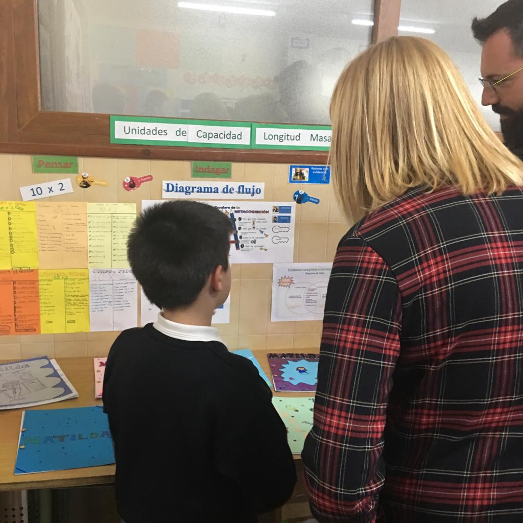 Por la tarde, se realizó una visita más detallada al interior del colegio: aulas, pasillos documentados, zonas interactivas…Durante este tiempo, los papás y mamás que nos visitaron estuvieron en todo momento acompañados e informados por sus hijos e hijas, quienes con mucho interés contaban nuestra metodología de trabajo y narraban con emoción su día a día con las llaves de pensamiento, hábitos de mente o fuerzas culturales.