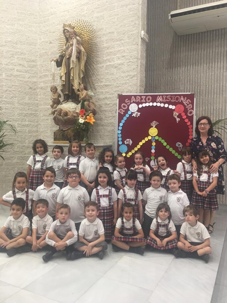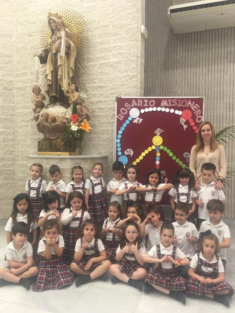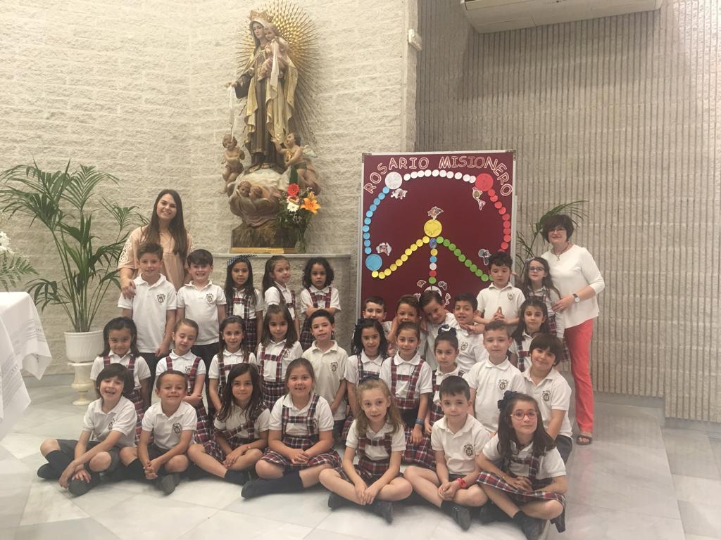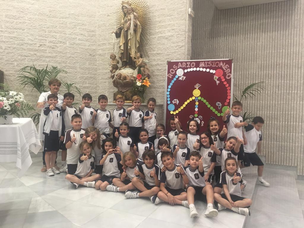 Hoy, trece de Mayo, hemos rendido en nuestro colegio un homenaje a la Madre de Jesús bajo la advocación de Fátima. En esta celebración hemos rezado de manera muy especial el rosario misionero. A través de él, por intercesión de María, hemos pedido al Padre por las intenciones y necesidades de todo el mundo.