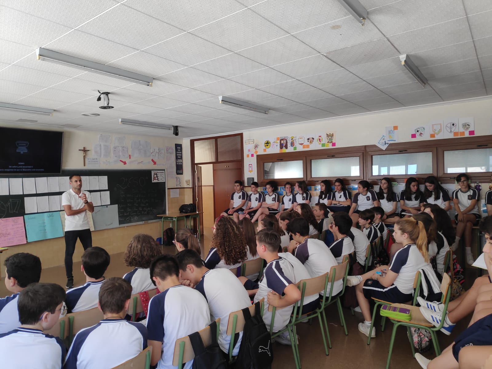 El futbolista profesional Juanma Ortiz (ex de Atlético de Madrid, Osasuna, Almería, Glasgow Rangers…) ha acudido esta mañana a nuestro centro para compartir con los alumnos de secundaria su experiencia como deportista de élite y la cara que no se ve del deporte. La charla ha tratado aquellos valores implícitos en el mundo deportivo, pero que, además, son cruciales para formarnos como personas y poder desarrollar un rol activo en la sociedad actual.