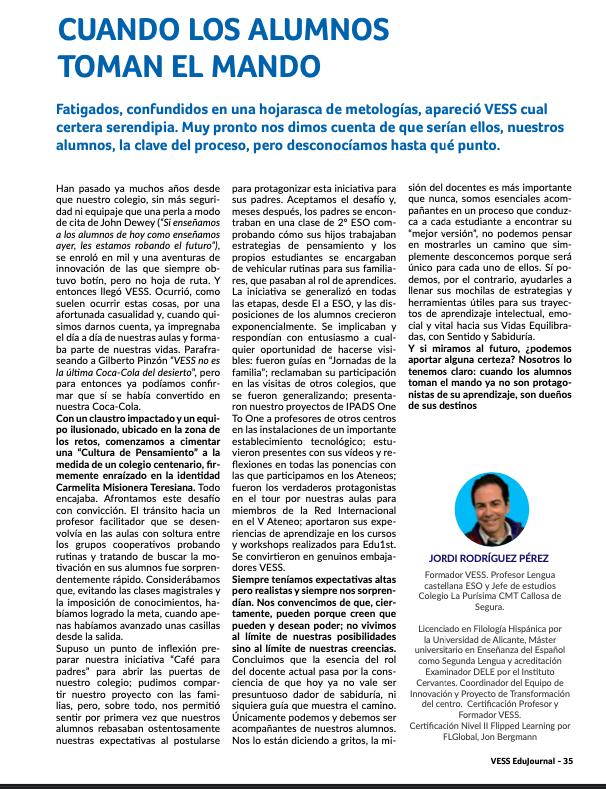 Edu1st.VESS cuenta con nuestro equipo de innovación en su número inaugural. Recoge la experiencia innovadora del Colegio La Purísima CMT de Callosa de Segura, como uno de los referentes de implementación del modelo VESS.