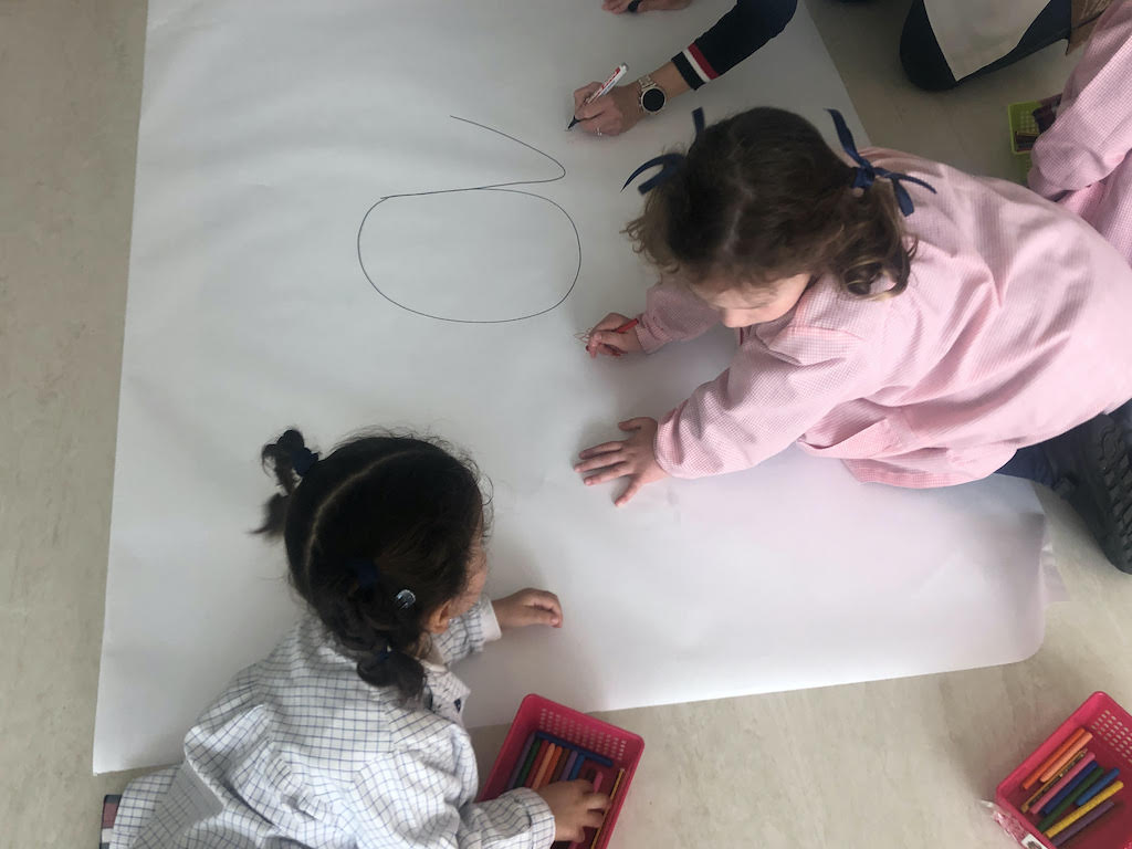 Es el turno de la A. Después de jugar al veo veo con palabras que contengan la vocal a pasamos a elaborar entre todos el mapa mental de la a con la técnica “Hablando con tizas”.