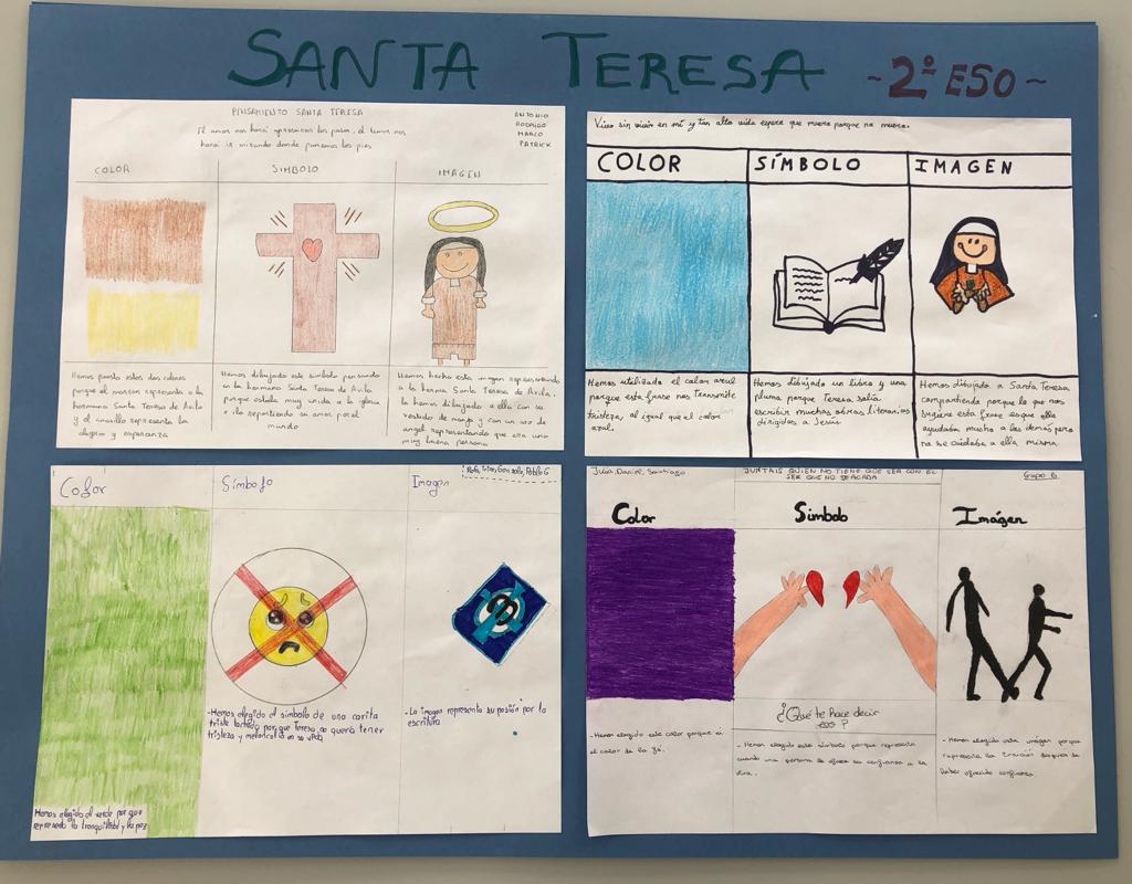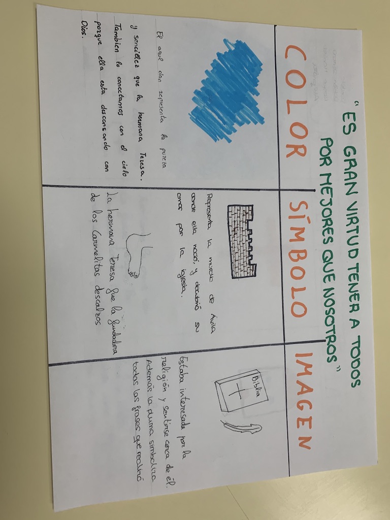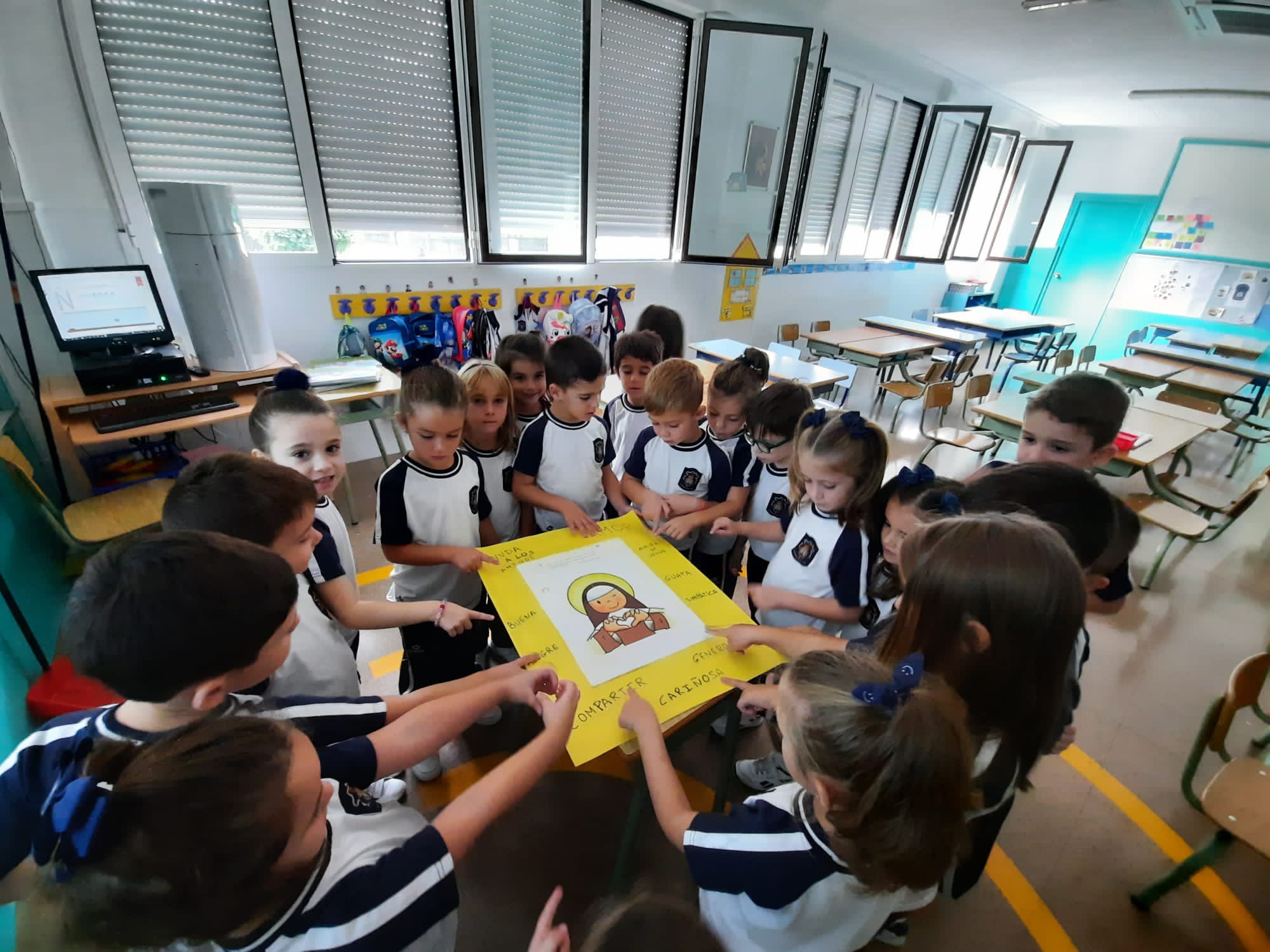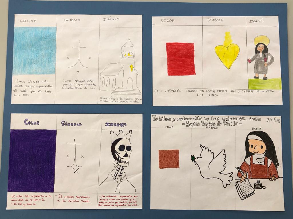 Educación Infantil y los primeros cursos de Educación Primaria han trabajado un 5X2 sobre los valores principales de Santa Teresa y lo han documentado en una cartulina con una imagen y un poema de la Santa.