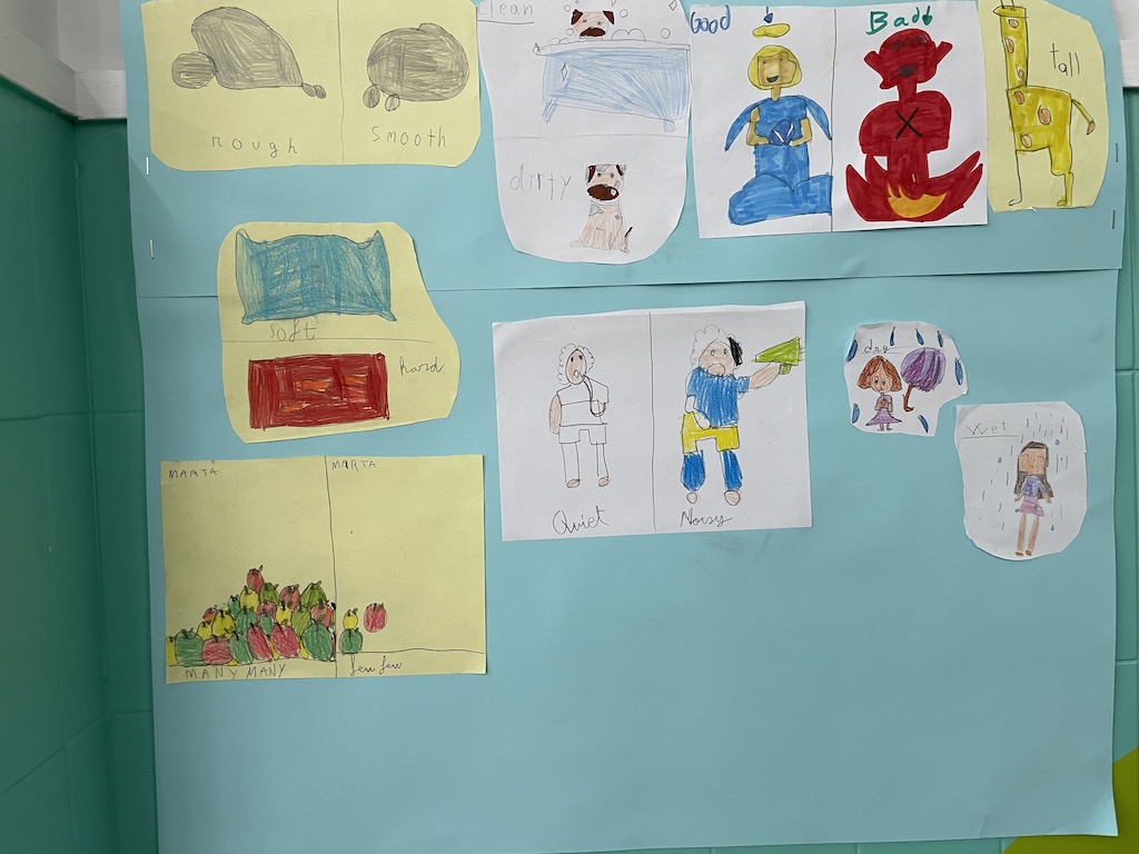 Los alumnos de 1º y 2º de primaria que asisten a las clases de inglés extraescolar aprenden el idioma a través de dinámicas y actividades lúdicas. En este caso trabajamos los opuestos (opposites) a través de la creación grupal de este genial panel de trabajo en el que los alumnos se han implicado mucho. GREAT JOB!